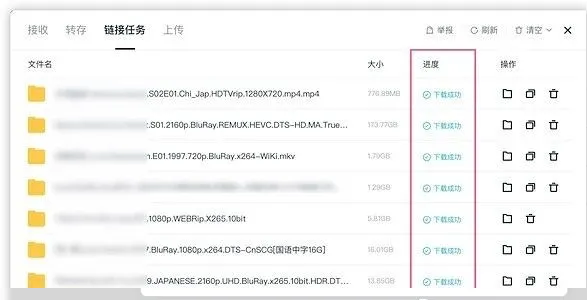 「传输」页面可以看到,上述 7 个链接用 115 网盘添加任务后都迅速下载成功了,非常舒服,小编愿称之为绝活!